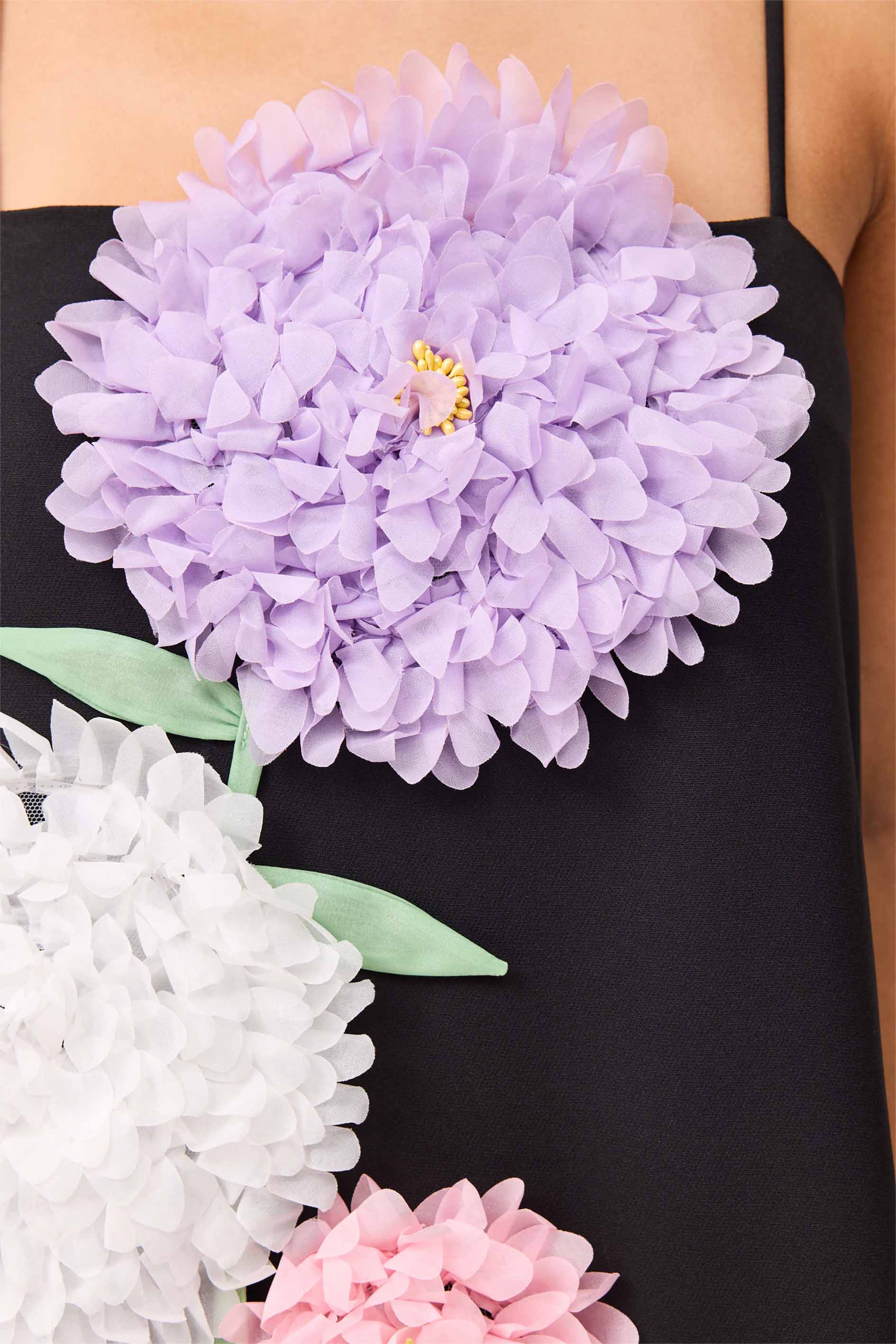Meet the Buttercup Embroidered Maxi Dress in Black—a showstopping piece that brings structured elegance and floral charm together in perfect harmony. This flower-embellished maxi dress features delicate multi-colour 3D flowers intricately placed across the bodice and skirt, offering stunning texture and visual interest for any formal moment.