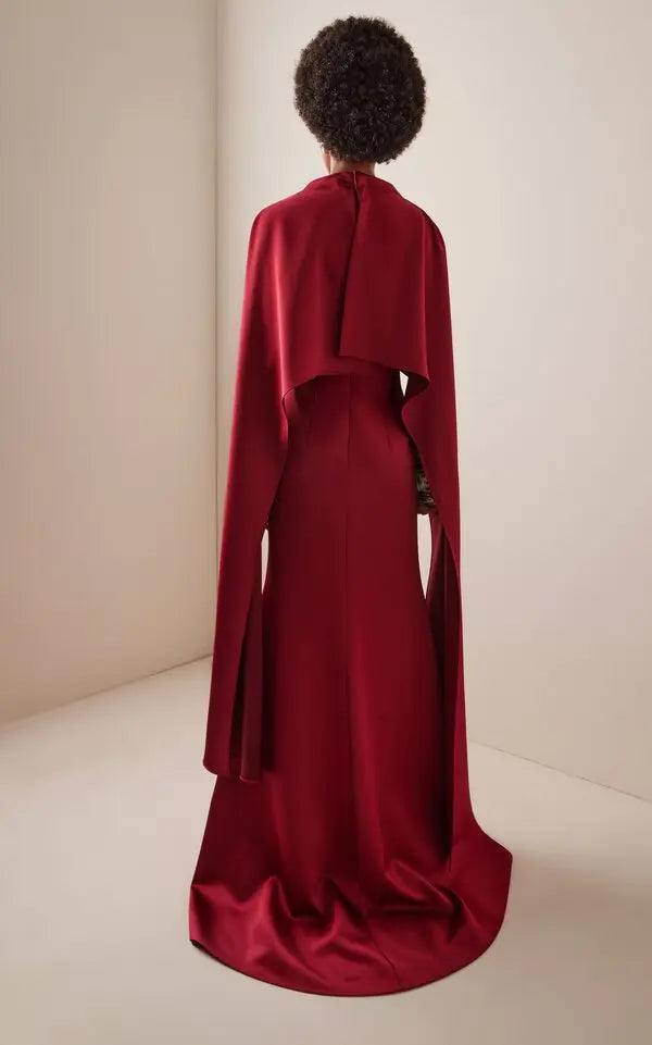 This elegant evening gown is crafted from lustrous crepe and features a cape effect that hangs over the shoulders. The Australia-based label Carla Zampatti has relaunched under the design direction of Karlie Ungar with a fresh, modern spin.
