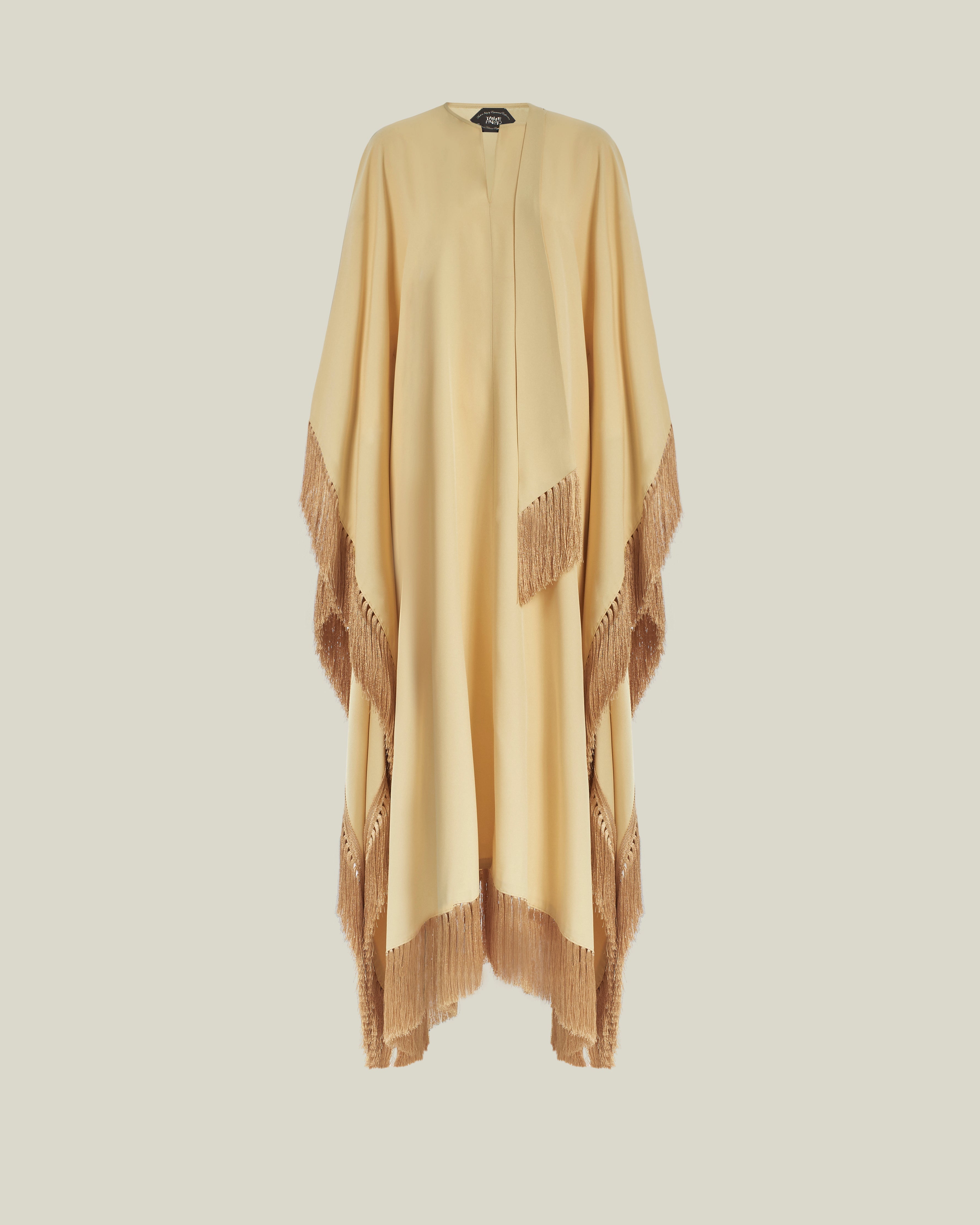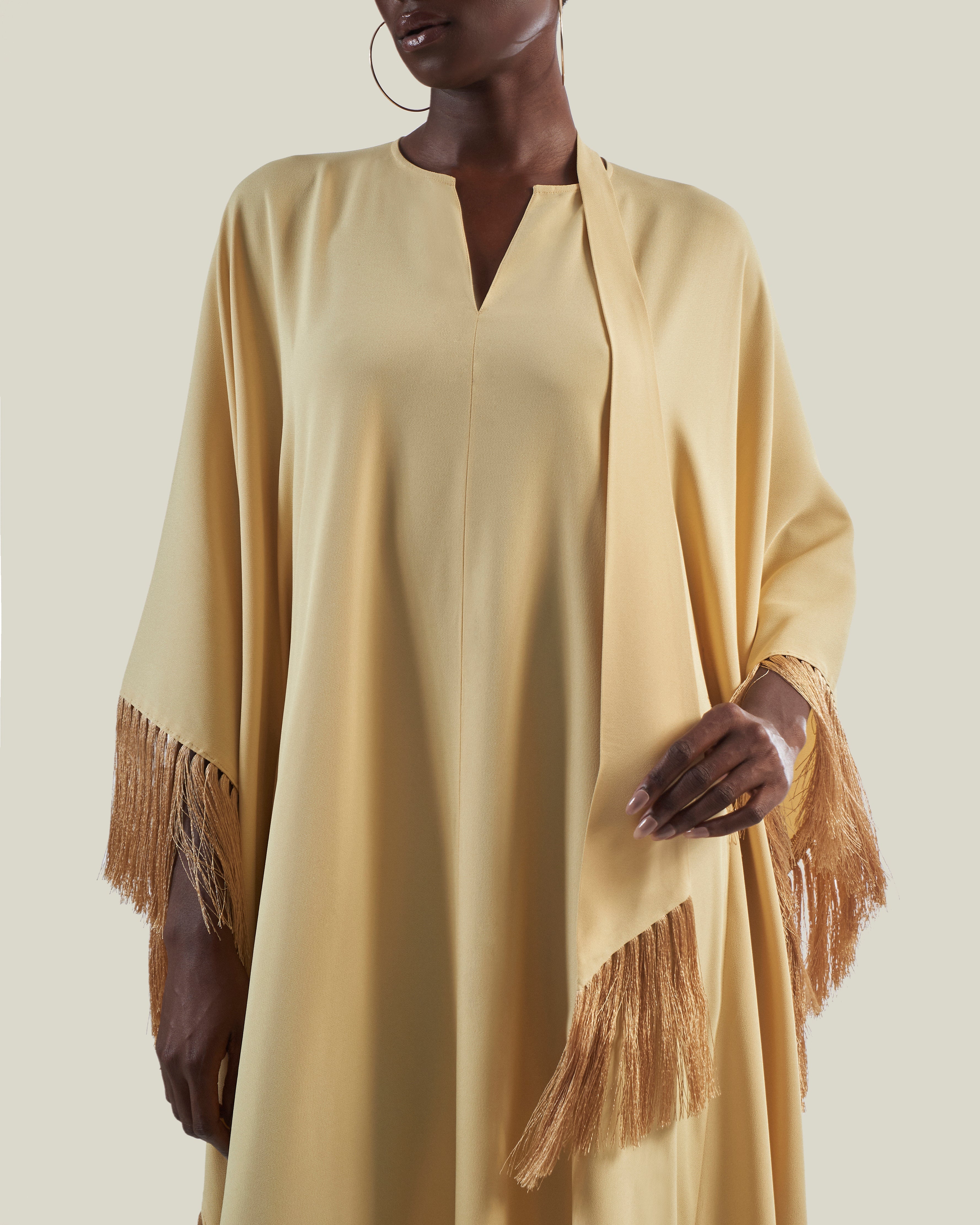 The Hammamet is a relaxed-fit. It features a softly rounded neckline with a subtle V-slit, offering a refined yet effortless charm. Fully trimmed with tonal soft fringes, it is finished with our signature attached fringed scarf that completes the neckline, adding movement and a laid-back attitude to the garment.