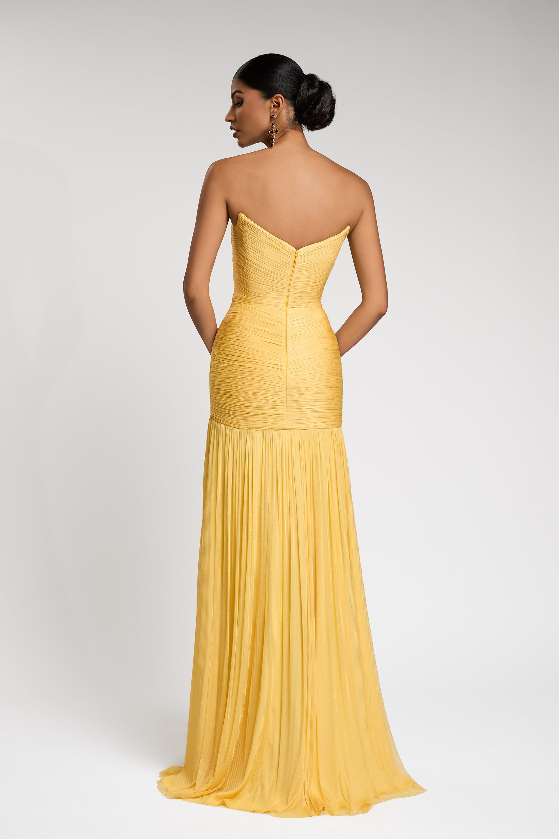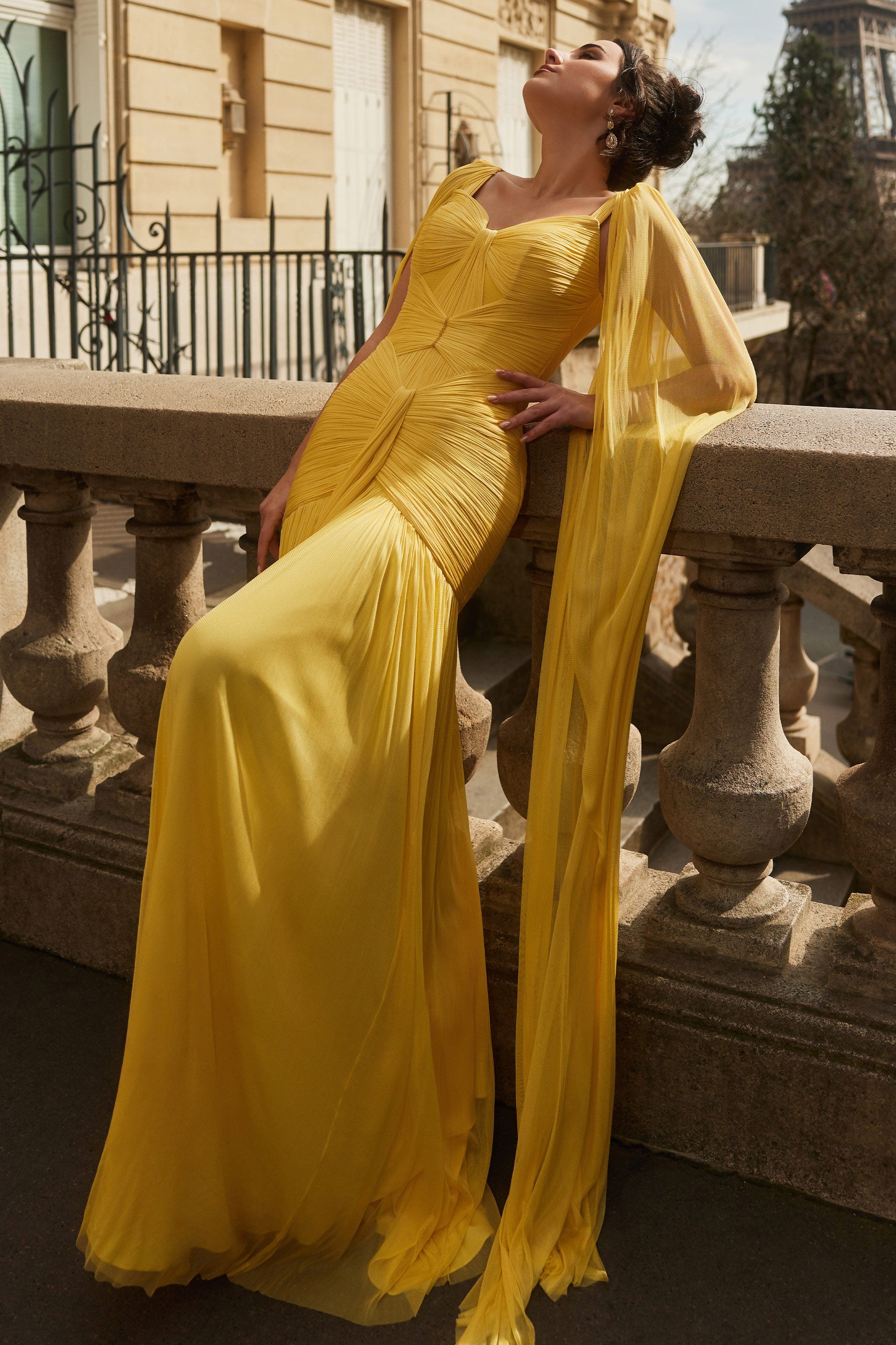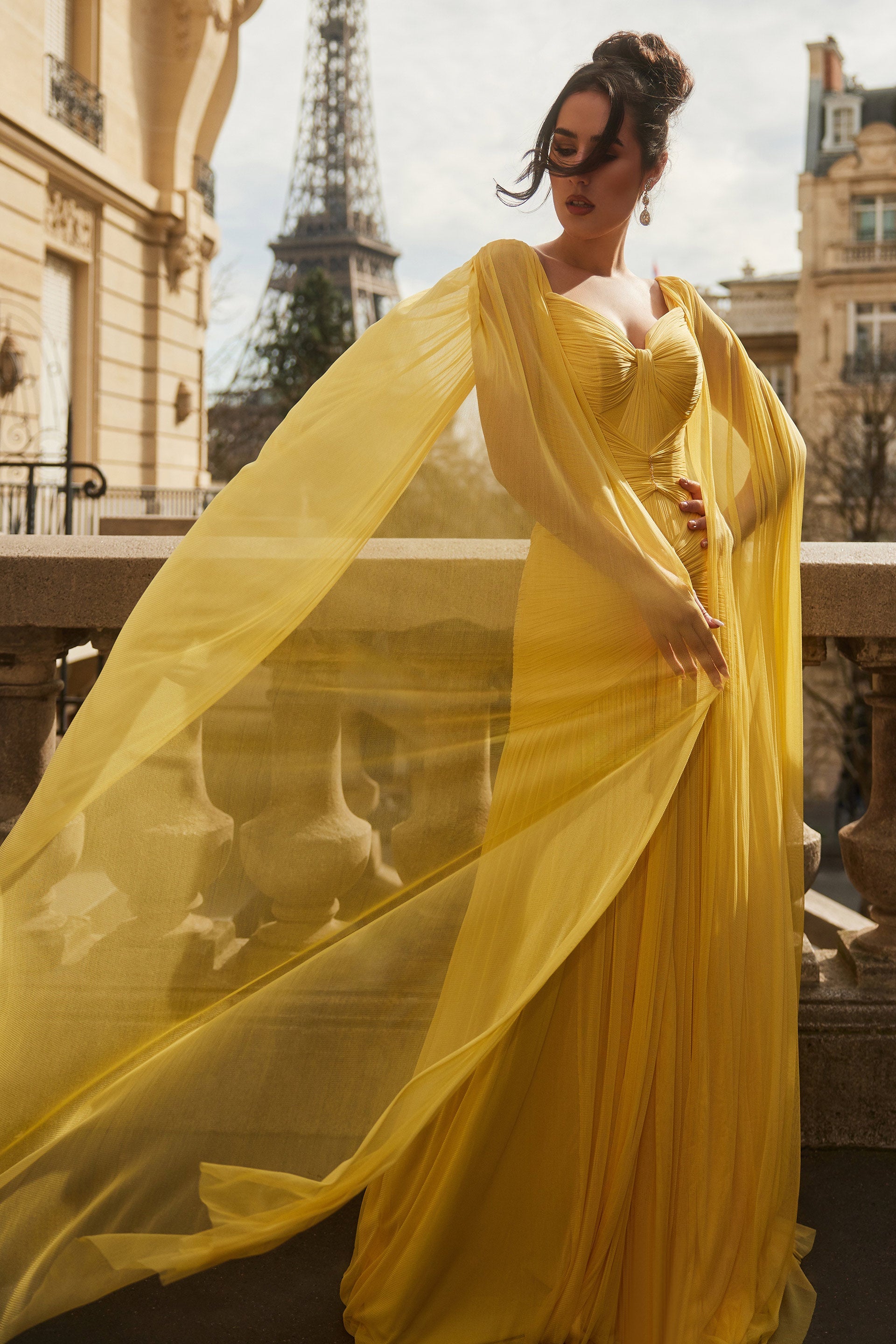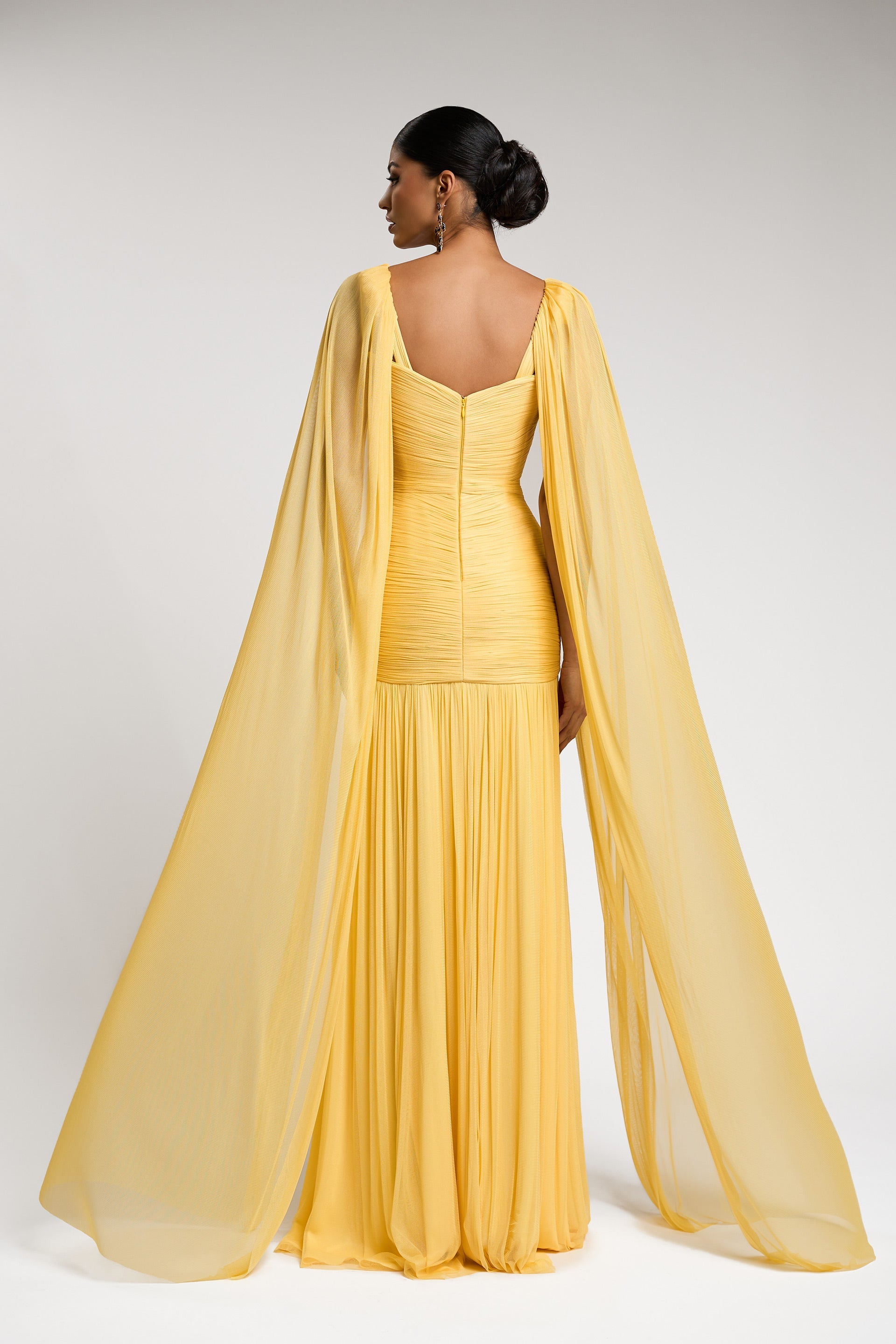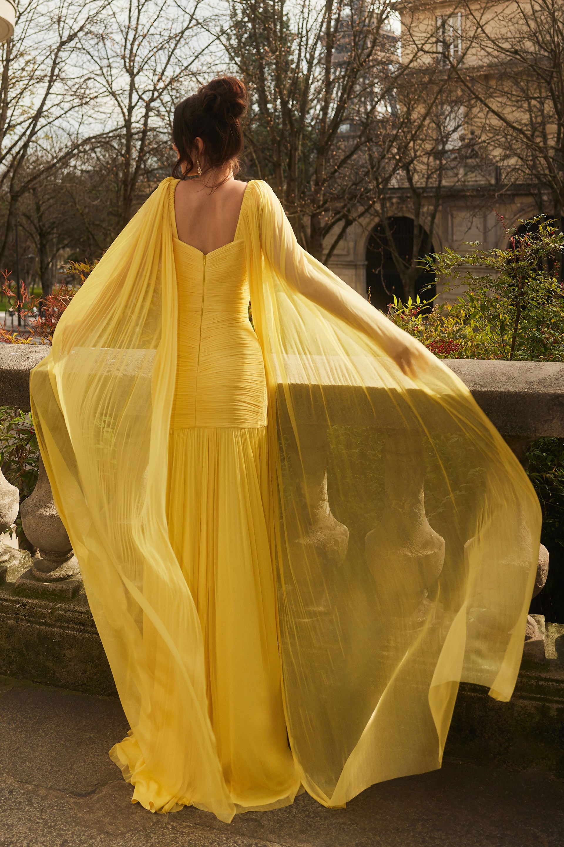 The Francesca dress impresses with sophisticated draping details. Carefully crafted cut-outs subtly accentuate the waistline, gently contouring the silhouette, while cape sleeves add a dramatic, flowing effect.