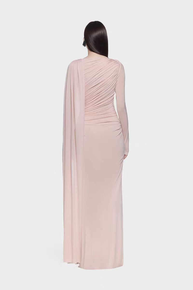 Long Sleeve Flowing Sash Knit Asymmetrical Ruched Elegant Maxi Dress