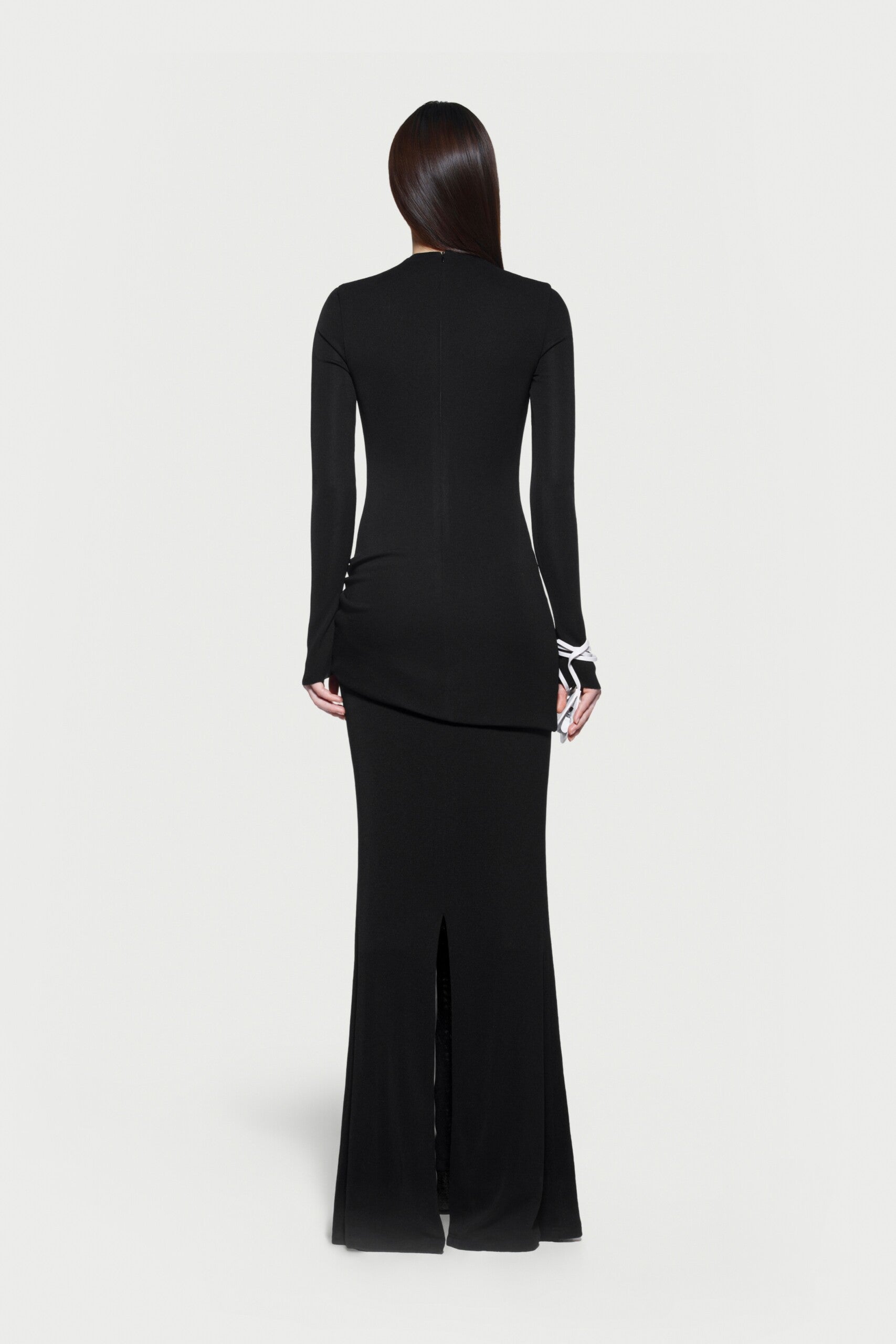 • Detail: Waterfall draping on hipline, Signature metalic detail