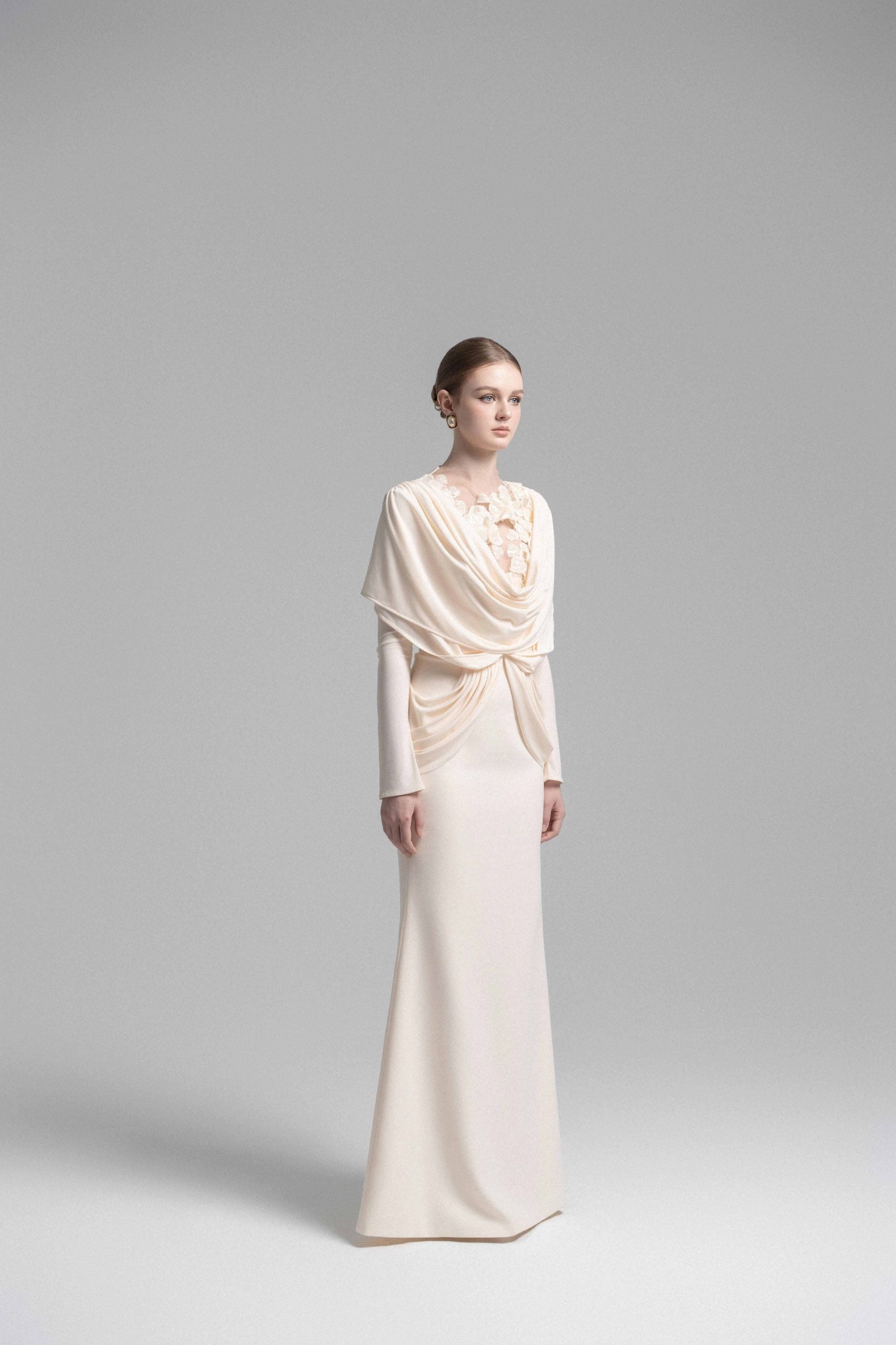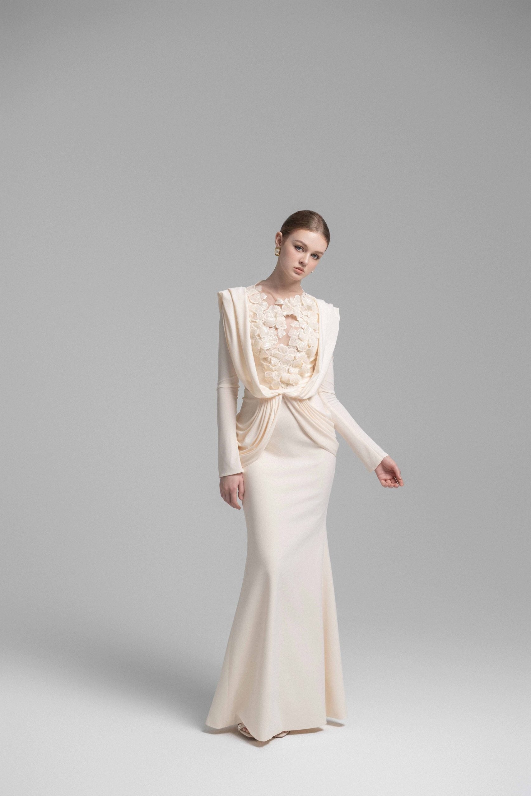 This mermaid dress features a soft draped hood for a fresh, elegant look. The pleated waist defines your shape, creating a
