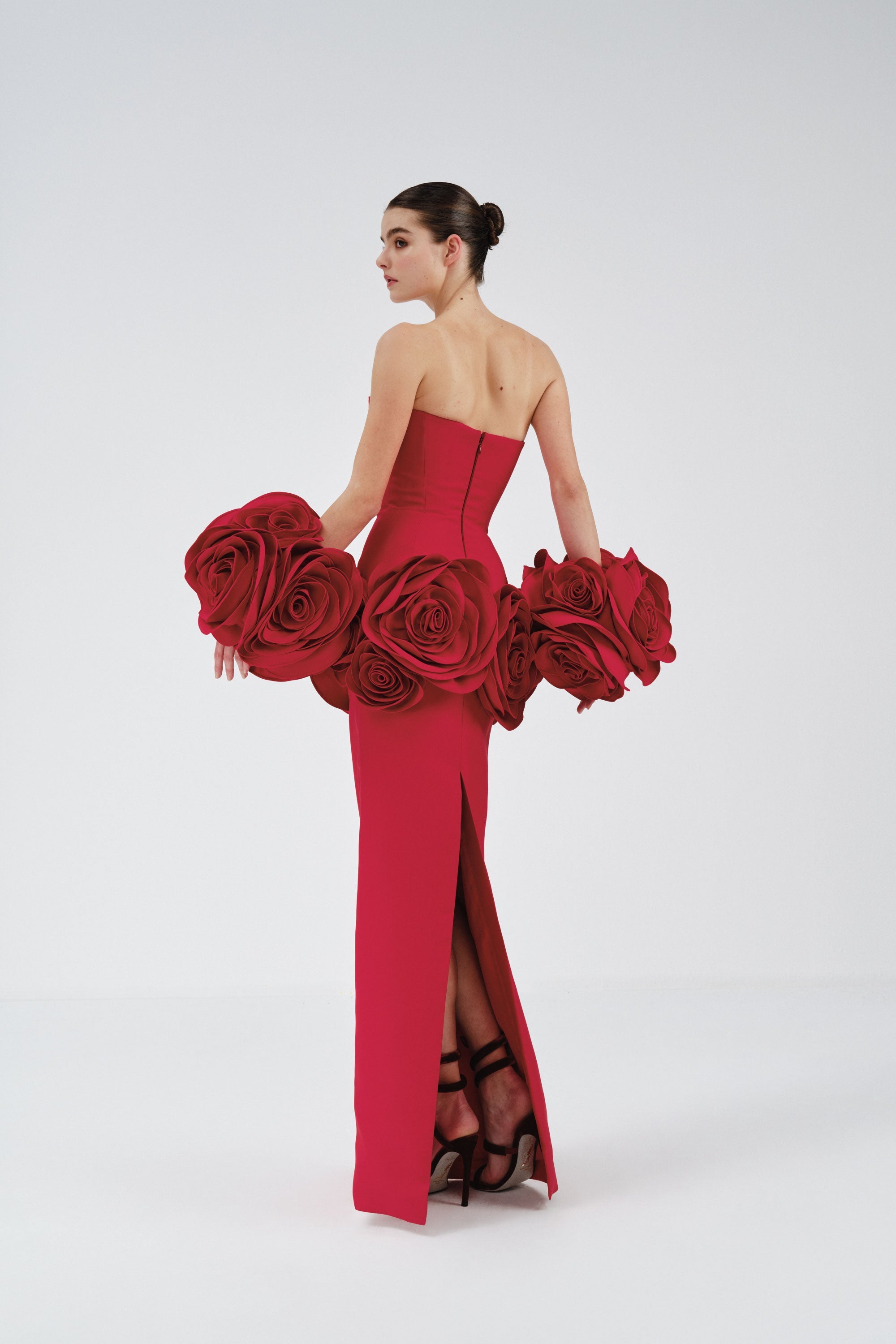 This red strapless dress features a sleek column silhouette, accentuated by oversized, sculptural roses encircling the hips for a dramatic and artistic touch. The unique floral detail adds a statement-making element to the minimalist design.
